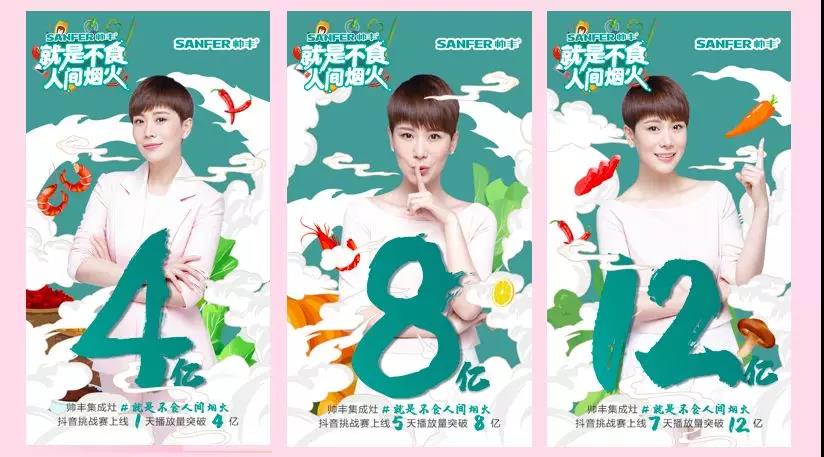 日前,帥豐集成灶在抖音平臺發起了#就是不食人間煙火 挑戰賽,作為行業首個全國挑戰賽,帥豐極具創意的新玩法和配備豐富的新奇工具引發年輕用戶的熱烈追捧,各路明星、達人紛紛曬出自己下廚房的“控煙大法”及護膚訣竅等生活點滴。短短十余天時間,此次帥豐集成灶#就是不食人間煙火 挑戰賽視頻總播放量達16.6億,累計評論次數超142萬次,累計分享次數45萬多次,點贊數更是高達2583萬次。經過這次活動,帥豐集成灶控煙率99.96%的產品競爭力已經給潛在消費者留下了深刻印象,其創造健康廚房的美好生活理念也深入人心。